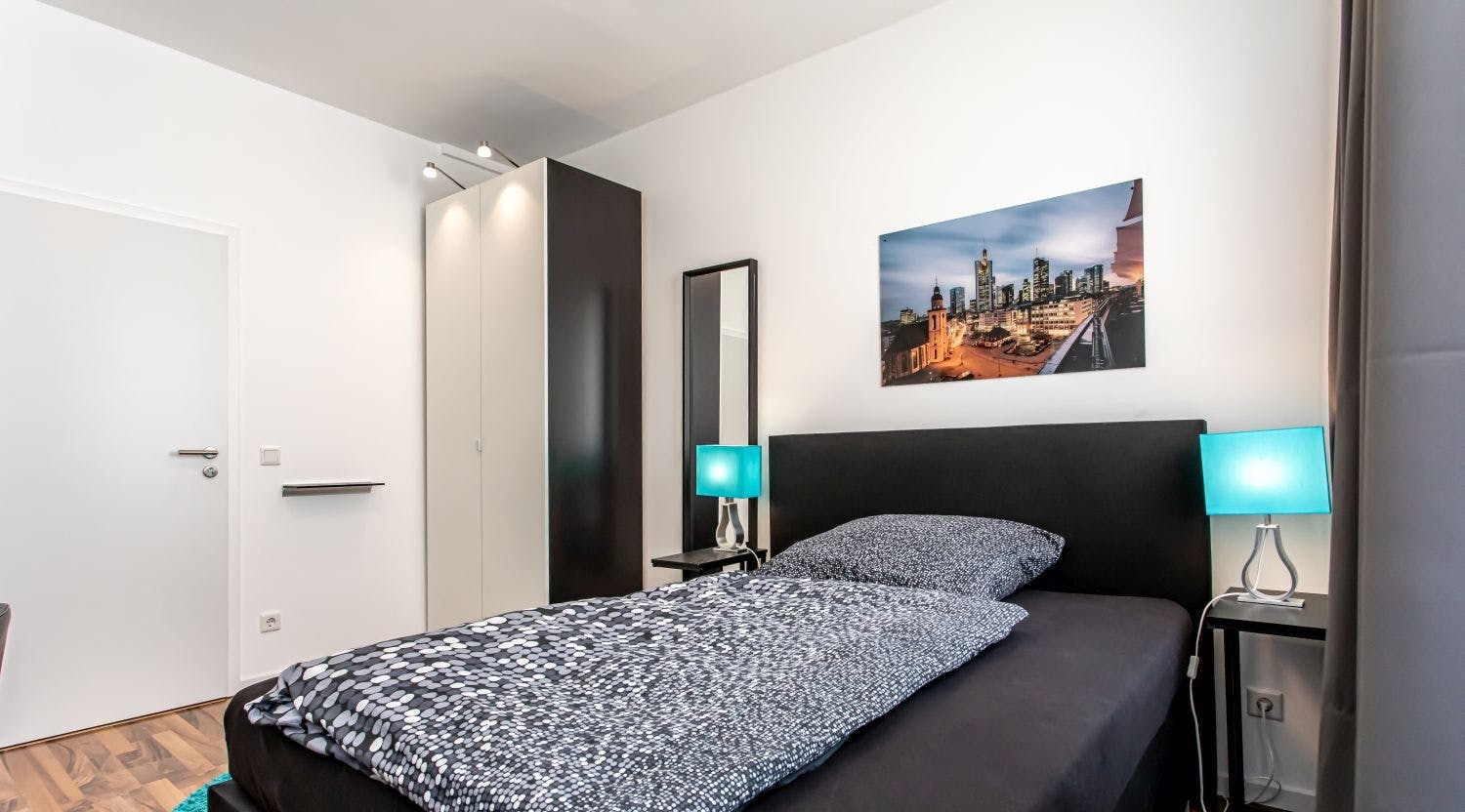 Object description: This 4-room shared flat is located on the 2nd floor of a multiple dwelling close to frankfurt central station. There is an elevator in the building. Each room as well as the common areas are fully furnished. Eqiupment: The rooms are equipped with a comfortable box spring bed including bedding and linen, spacious wardrobe, flat screen TV, side tables, desk and desk chair. In addition, the shared flat has a central free WIFI access for all residents. The kitchen has a dining area and a modern kitchenette with the basic equipment of dishes and cooking utensils. Here, the flatmates have everything they need...