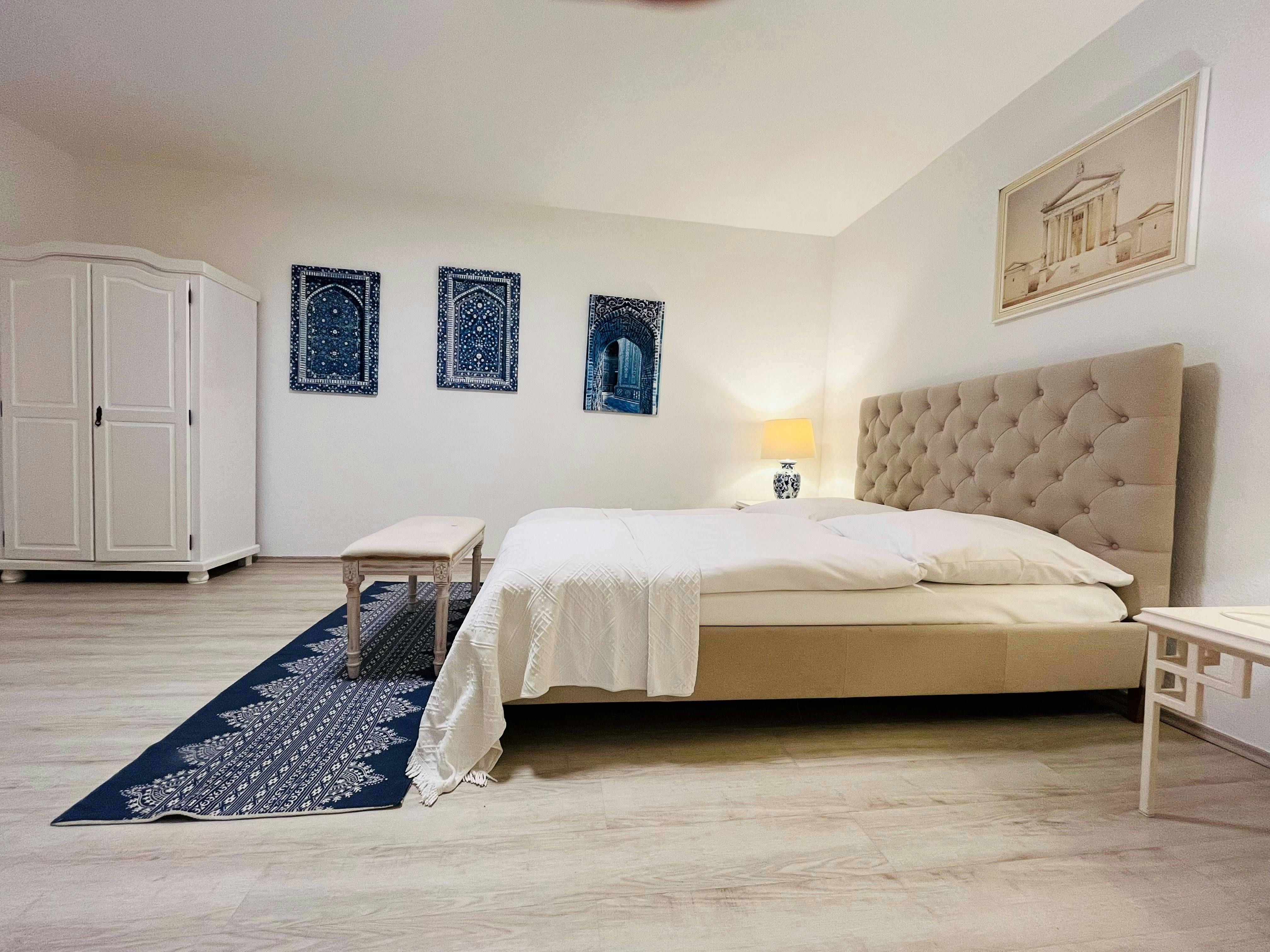 In our newly renovated 85 square metre basement flat you will find a fully equipped kitchenette, a bathroom with bathtub and a bedroom with double bed. The separate living room, with a sofa bed, is just as comfortably furnished as the rest of the flat. WLAN is available free of charge during your stay. Washing machine and tumble dryer are available for communal use in the building for a fee. Parking spaces are available on the premises for a fee ( depending on availability). On request you can book a complete intermediate cleaning. This costs €100.00 per cleaning or €150.00 per...