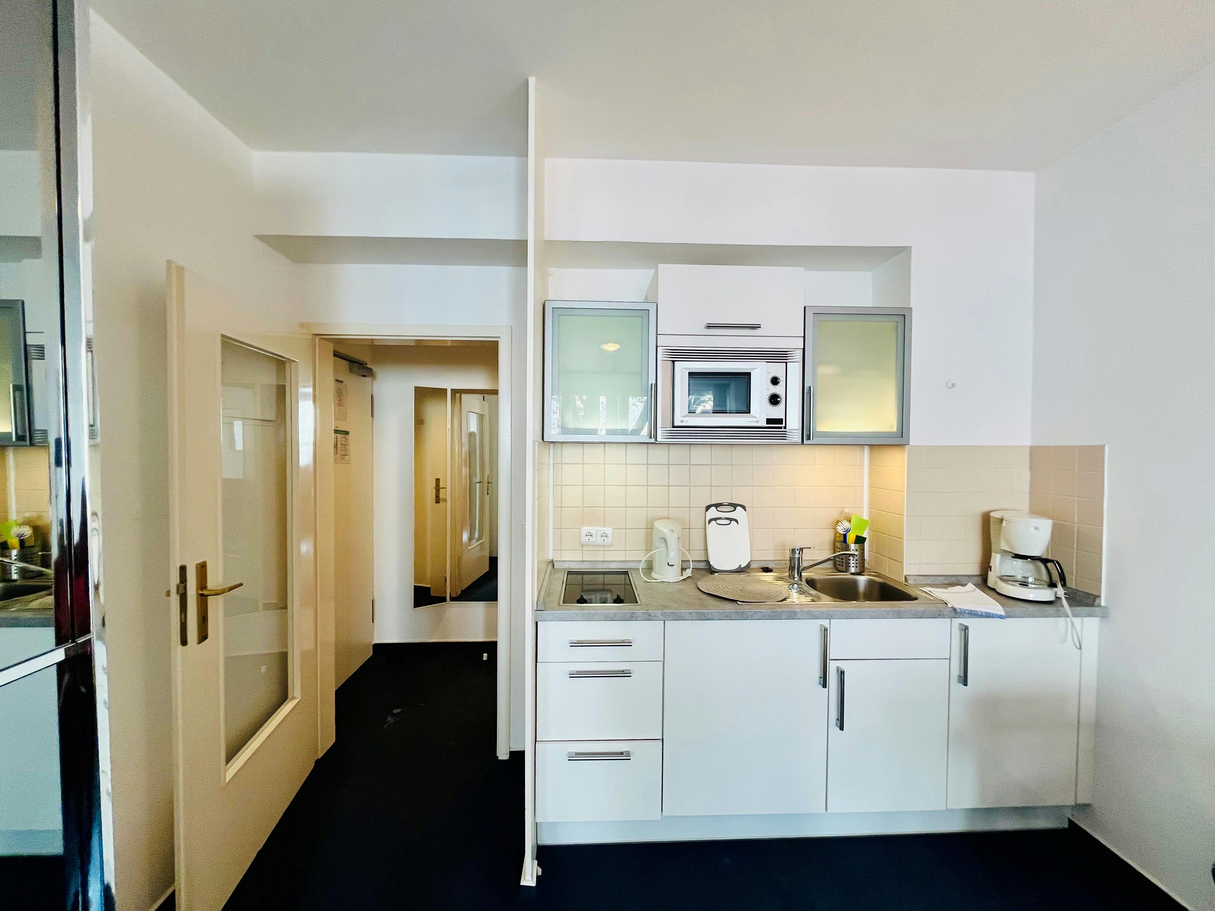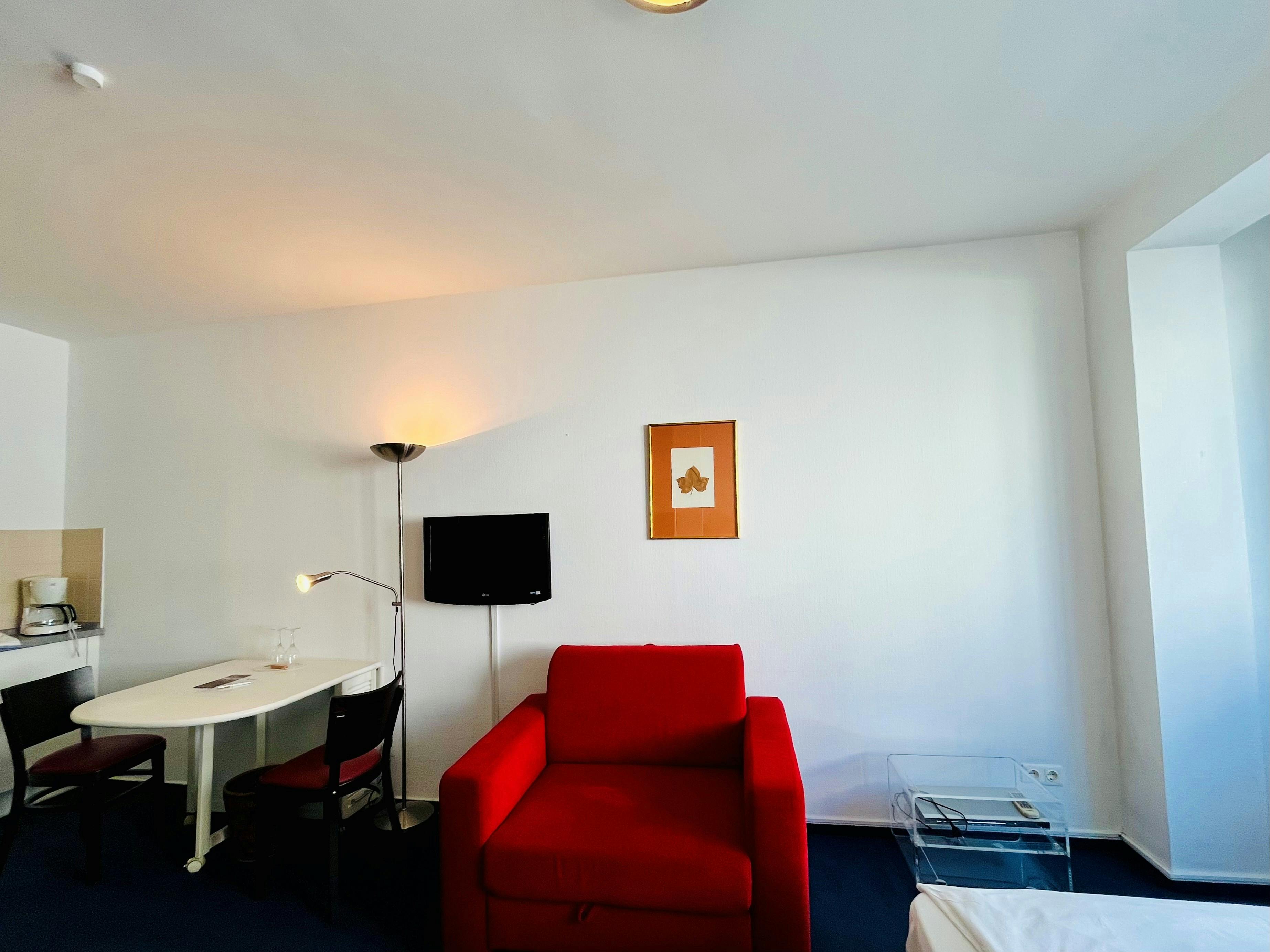 Our 30sqm double studio is furnished with a double bed as well as a small living area with sofa bed. A desk/ dining table and a fully equipped kitchenette provides you a pleasant ambiance. The bathroom is either equipped with a shower or bathtub. WLAN is available free of charge during your stay. Washing machine and tumble dryer are available for communal use for a fee. Car park on request ( for a fee). On request you can book a complete intermediate cleaning. This costs €100.00 per cleaning or €150.00 per cleaning including linen change (bed linen and towels). In our apartments...