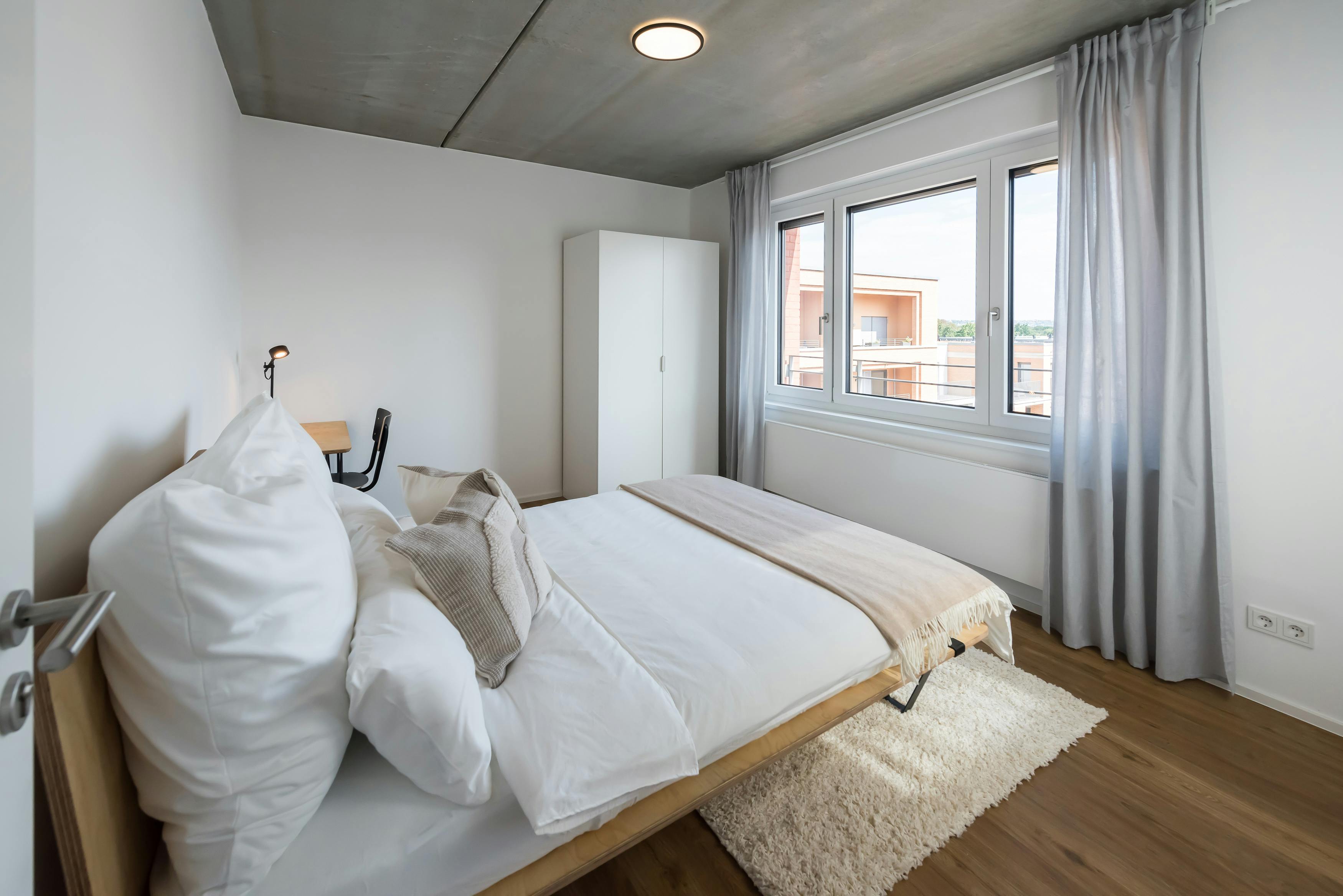 ROOM Our rooms come fully furnished with everything you need for a comfortable daily life, such as a bed with a premium mattress with bedsheets, pillows, and duvets, a large wardrobe, table, and chair for work with a lamp. Some rooms also have a private or shared balcony or terrace for you to enjoy the sunshine. APARTMENT Each flat has a fully equipped modern kitchen that has everything from pans to a coffee machine, dishwasher, and oven. All apartments have spacious bathrooms that you will be sharing with your flatmates. PROPERTY The property is purposefully built to be an ideal location for you to enjoy...