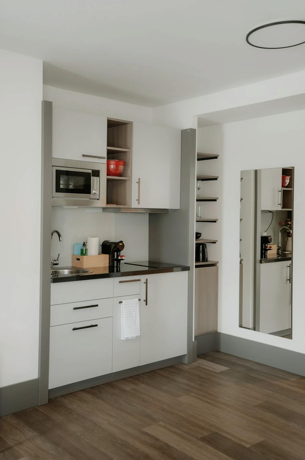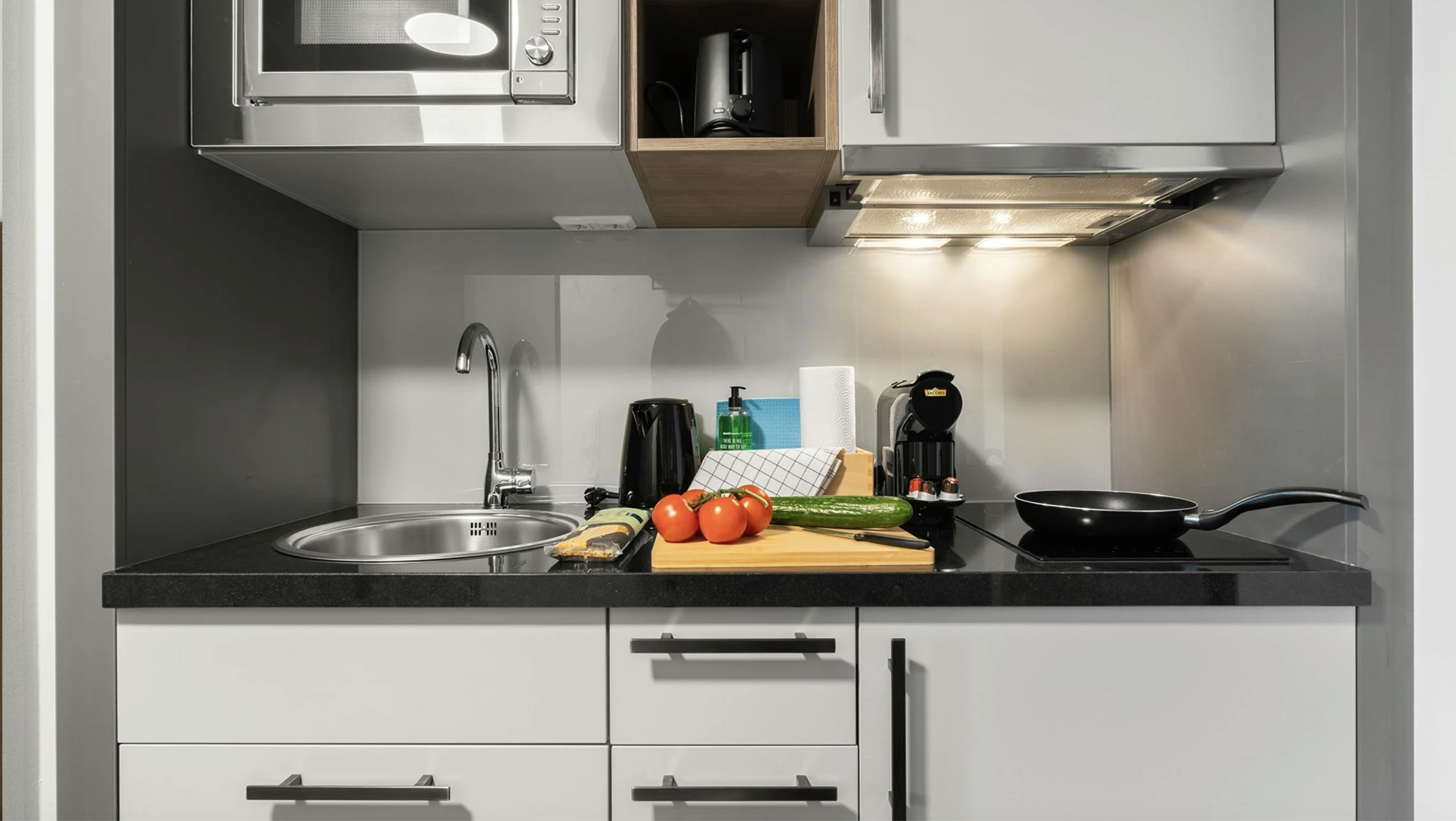 Allgemein: 1-2 Personen Zimmergröße 33m2 Bettgröße 160cm Highspeed-Internet Persönlicher Briefkasten​ Gegensprechanlage Gebäude 24/7-Check-In Aufzug Co-Working Living Lobby Snack- & Getränkeautomat Laundry Room Putzmittelraum PKW-Stellplätze Fahrradstellplätze Gastronomie in der Nähe Wohnbereich SMART-TV Sitzgelegenheit Kleiderschrank Küche: 2 Kochplatten Geschirrspüler Kühlschrank mit Gefrierzone Nespresso Maschine Mikrowelle Wasserkocher Toaster Kochausstattung Besteck/Geschirr Badezimmer Dusche Hochwertige Pflegeprodukte Haarföhn Handtücher Reinigung Wöchentliche professionelle Reinigung Waschmaschine (kostenpflichtig) Trockner (kostenpflichtig) Bügeleisen (kostenlos) Wäscheständer (kostenlos) Putzmittel (kostenlos) Extras Wasssersprudler (kostenlos) Gewürze und Öl (kostenlos) Keine Haustiere Keine Klimaanlage