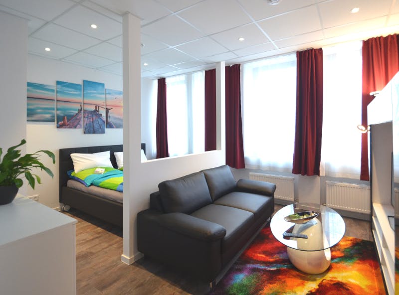 ✔️ Fully furnished, modern, and comfortable – move in with just your belongings ✔️ Designed for singles or couples – includes a double bed and private bathroom ✔️ Monthly cleaning service with towel and bed linen changes included ✔️ High-speed internet, television, and a fully equipped kitchenette ✔️ Laundry room with washing machines and dryers available on-site (coin-operated) Cozy 1-Room Apartment in Frankfurt-Niederrad This cozy 1-room apartment is tailored for singles or couples, offering a double bed, a private bathroom with a shower, and a kitchenette with complete equipment. Additional amenities include a closet with a built-in safe, internet, television, bed linen, towels, and tasteful decoration....