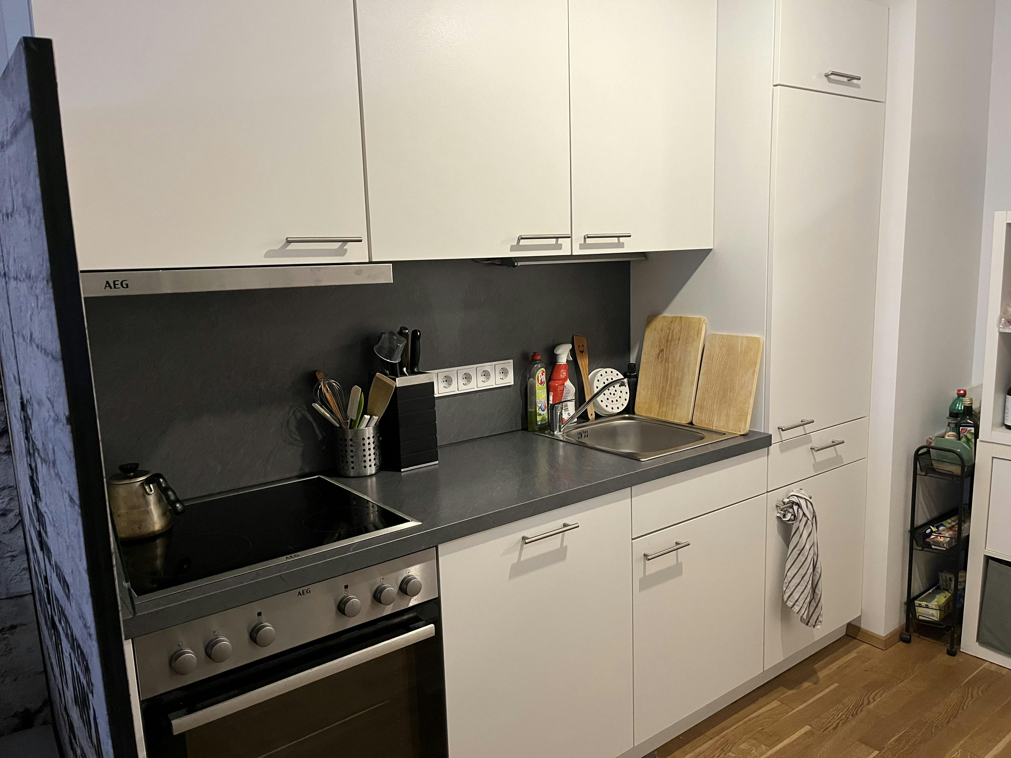 The apartment is available from 24.01.2026 until 28.02.2026. The apartment is fully equipped with everything you need for living and cooking. From dishes and cutlery to modern kitchen appliances, everything is provided. Stay connected all the time with high-speed internet connection included in the rent. A secure parking space is included, so you don't have to worry about finding a parking spot. The nearest tram and train stations are just a 5-minute walk away, providing quick access to the city center and other districts as well as to the airport. Pets and smoking are not allowed in the apartment.