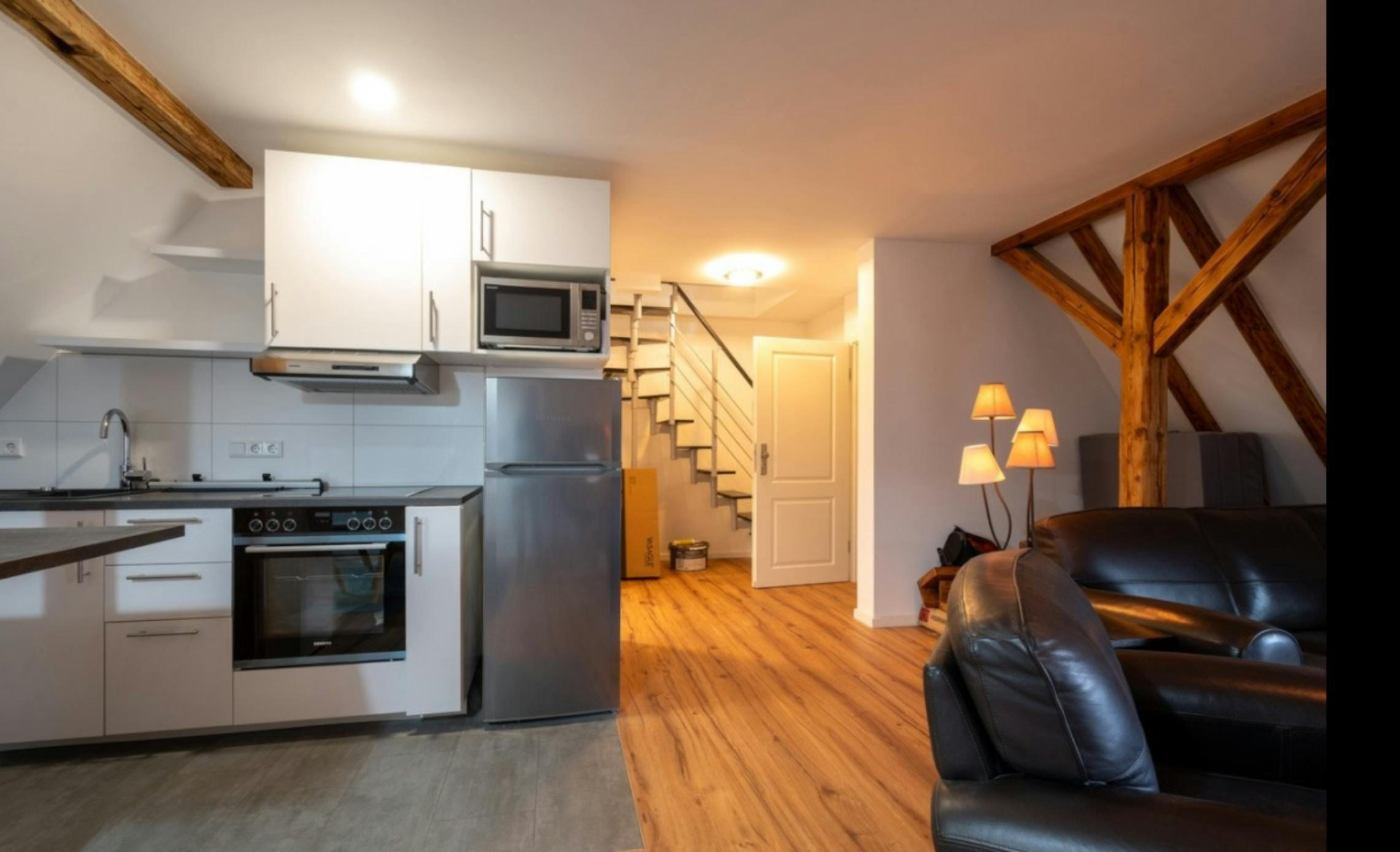 ?Exclusive Renovated Loft Apartment over Two Levels ?This spacious and beautifully designed loft apartment is located on the 2nd floor of a two-family terraced house, spread over two levels. The property is situated in a small, extremely quiet private street in Frankfurt Griesheim-Nord, part of a former historic Art Nouveau workers' colony – a charming and unique residential area. The entire house and apartment were completely renovated and modernized to the highest contemporary standards. Throughout the apartment (except the bedroom), underfloor heating combined with high-quality Parador laminate and tiles ensures a warm and comfortable atmosphere. Upon entering the apartment, you step into...